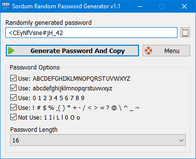 Le générateur de mots de passe aléatoires Sordum possède une interface minimaliste. Vous pouvez choisir parmi plusieurs options pour créer un mot de passe personnalisé, comme utiliser des majuscules, des minuscules, des chiffres ou des caractères spéciaux. Vous pouvez également exclure certains de ces caractères des mots de passe générés aléatoirement, puis utiliser le bouton « Générer un mot de passe » pour créer un mot de passe aléatoire. Le bouton de menu propose d’autres options, comme « Copier après génération » et « Générer un mot de passe en ligne ».