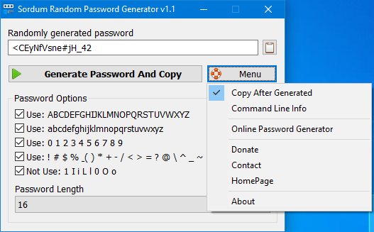 Un menu déroulant à la fin de l’interface graphique permet de sélectionner la longueur du mot de passe aléatoire. Le générateur de mots de passe aléatoires Sordum prend en charge le paramètre Cmd. Voici les commandes prises en charge.